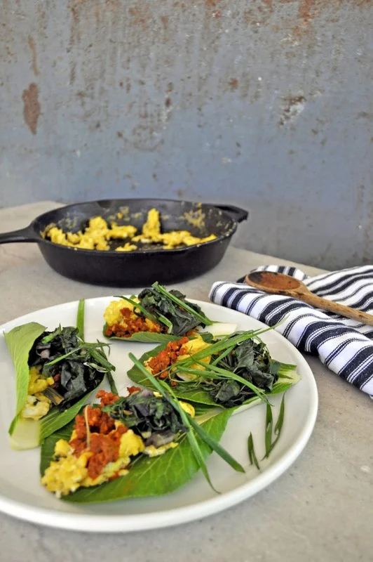 Infinitely adaptable, loaded with sustenance, a good breakfast taco is one of our family’s top 10 go-to meals. Substitute a leaf of pak choi for the tortilla, and they’re also 1000% local without sacrificing at all the crunch and savor of a big plate of tacos.